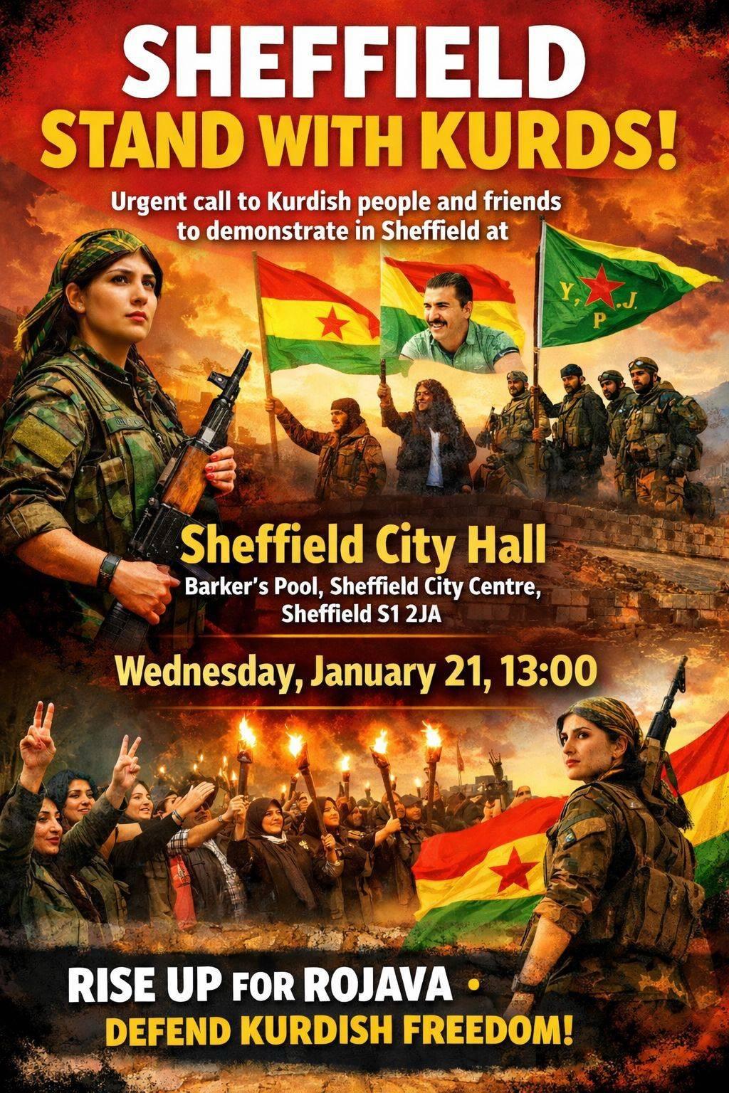 « All Events Sheffield Stand with Kurds January 21 @ 13:00 - 14:30 « Brighton Solidarity Demo Newcastle #DefendRojava » Add to calendar Google Calendar iCalendar Outlook 365 Outlook Live Details Date: January 21 Time: 13:00 - 14:30 Event Category: Defend Kurdistan Venue Sheffield City Hall Sheffield City Hall, Barker's Pool Sheffield, S1 2JA United Kingdom + Google Map
