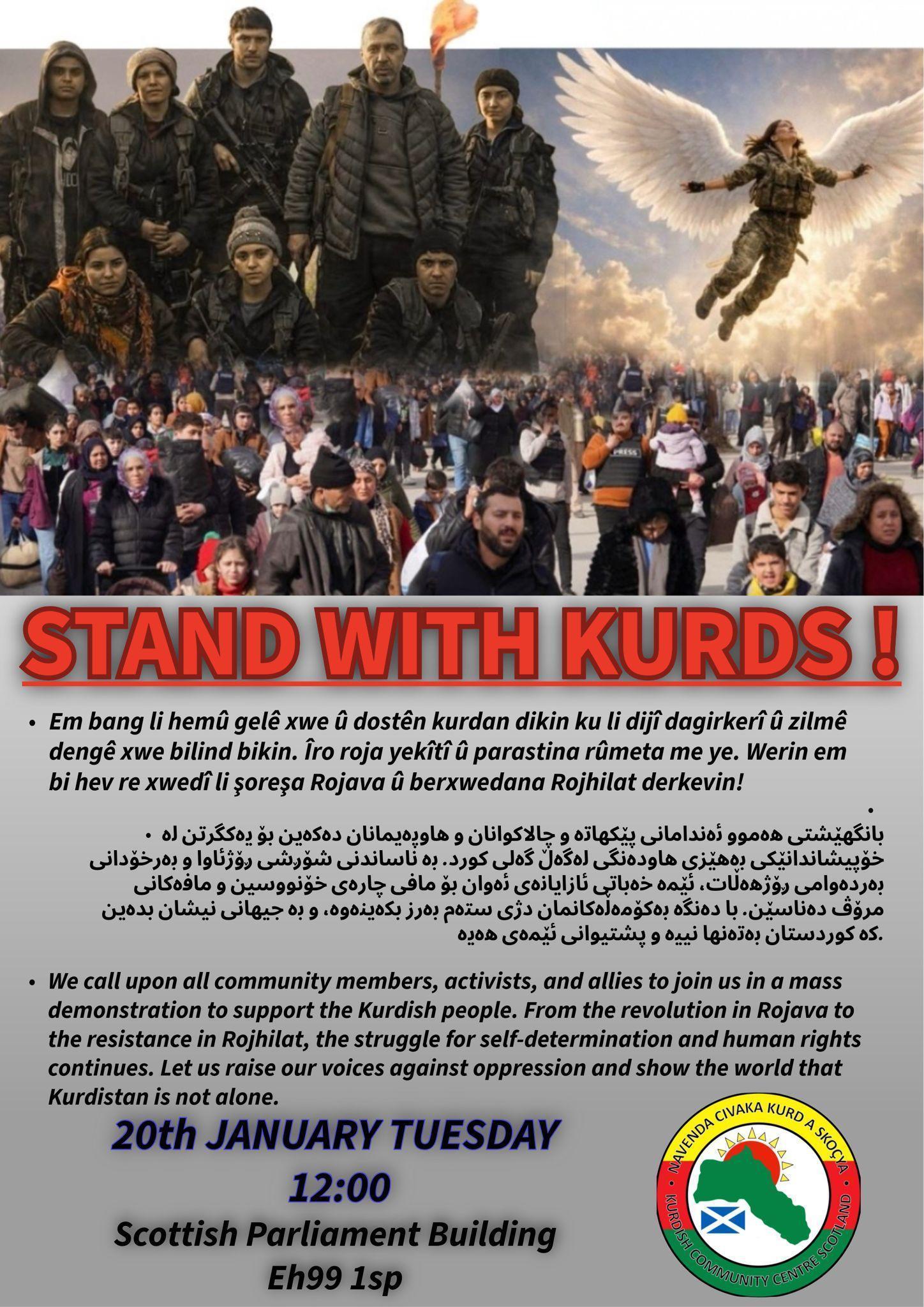 We call upon all community members, activists, and allies to join us in a mass demonstration to support the Kurdish people. From the revolution in Rojava to the resistance in Rojhilat, the struggle for self-determination and human rights continues. Let us raise our voices against oppression and show the world that Kurdistan is not alone.