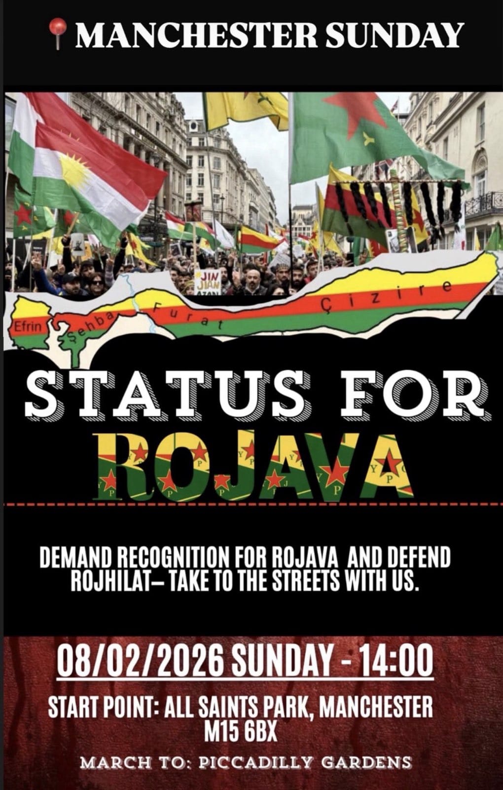 « All Events Status For Rojava (Manchester) February 8 @ 14:00 - 16:00 « National Demonstration for Rojava: Status for Rojava! (London) ‘Governance of Resistance in North and East Syria: The Experience of Rojava’ Book Launch » Add to calendar Google Calendar iCalendar Outlook 365 Outlook Live Details Date: February 8 Time: 14:00 - 16:00 Venue All Saints Park, Manchester All Saints Park Manchester, M15 6BX United Kingdom + Google Map