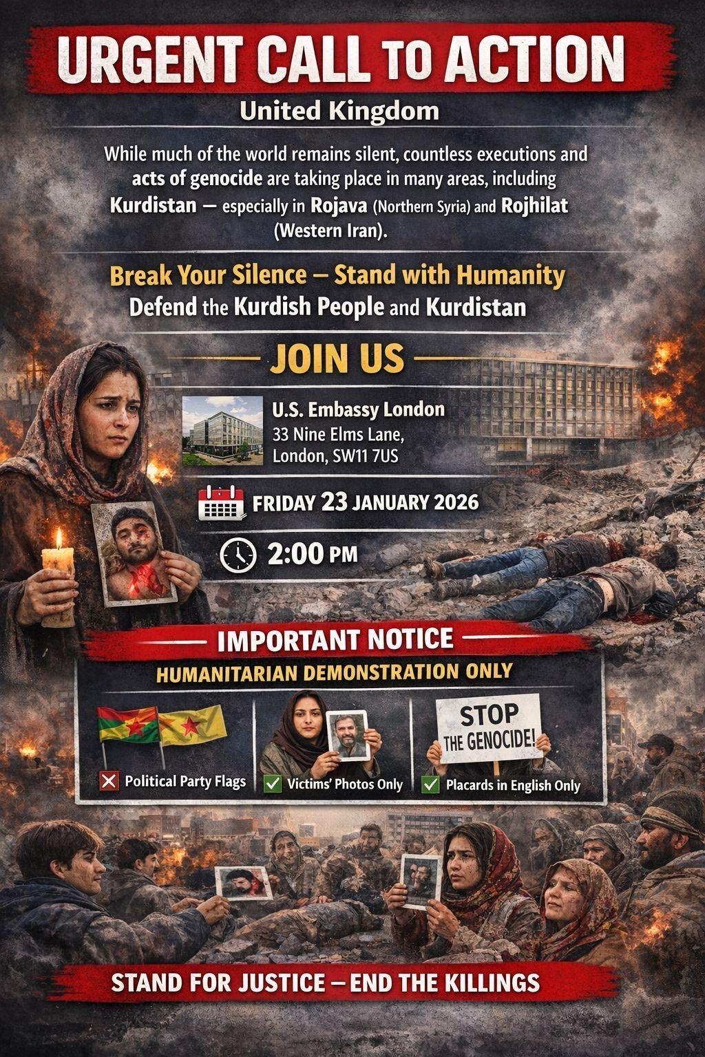 « All Events Urgent Call to Action (London) January 23 @ 14:00 - 15:30 « 🚨 Emergency information session on Rojava 🚨 Bristol Demand Action for Kurds » Add to calendar Google Calendar iCalendar Outlook 365 Outlook Live Details Date: January 23 Time: 14:00 - 15:30 Event Categories: Defend Kurdistan, London Venue US Embassy London 33 Nine Elms Lane London, SW11 7US United Kingdom + Google Map