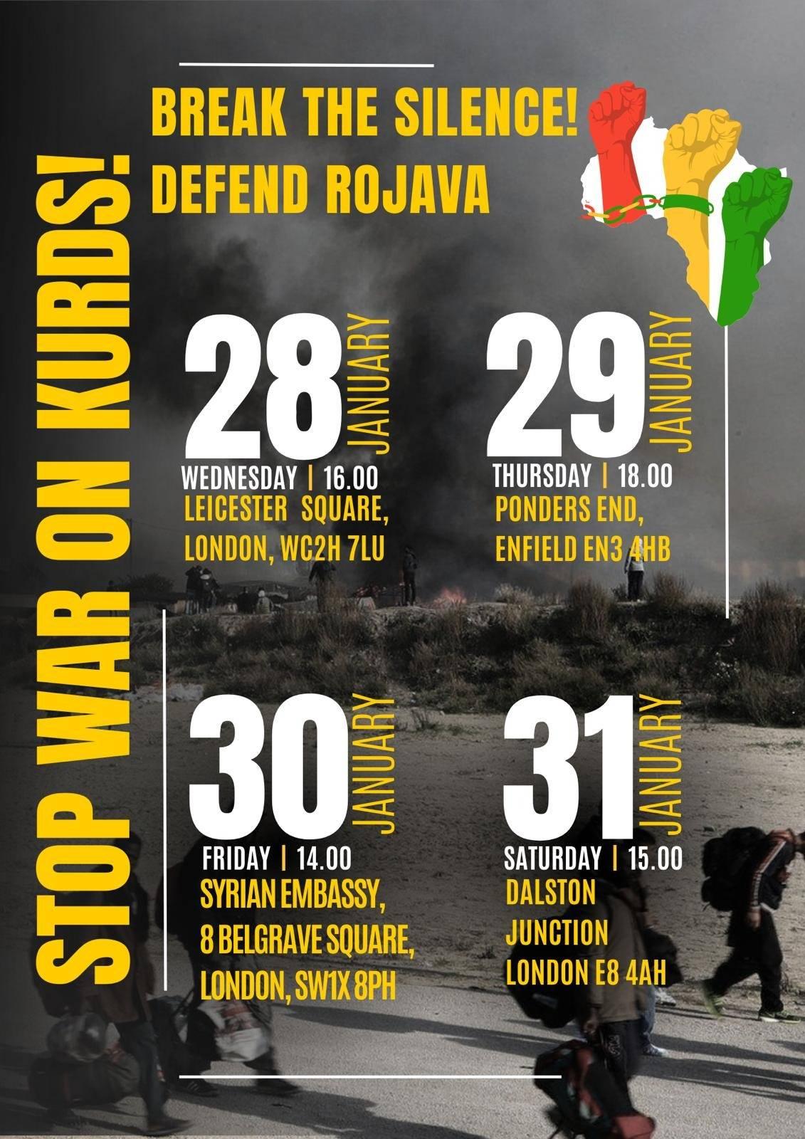 Saturday 24th January, 2pm - 5pm Trafalgar Square, London, WC2N 5DS Stand with Rojava Kurdistan - for freedom, justice, democracy and national rights Kurds unite against oppression! |