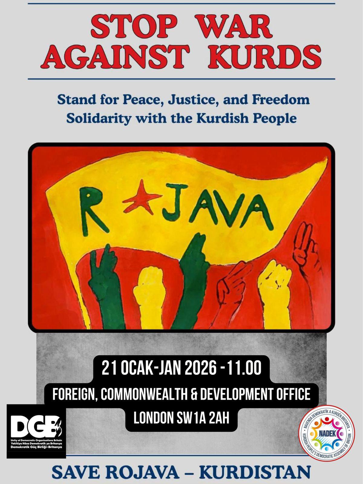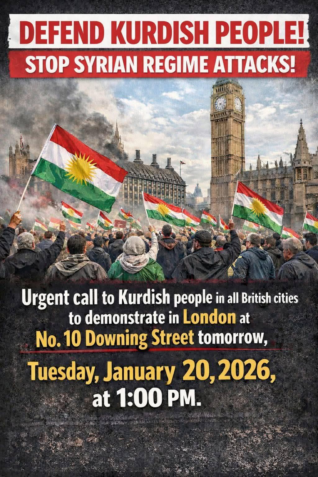 10 Downing Street 10 Downing Street, London, United KingdomUrgent Call 🚨 We call on all Kurds and everyone who supports human rights across all British cities to join a demonstration in London: Where: No. 10 Downing Street When: Tomorrow, Tuesday, January 20, 2026, at 1:00 PM The Kurds in Rojava are facing a real threat from terrorists, including massacres, killing of prisoners, looting […]